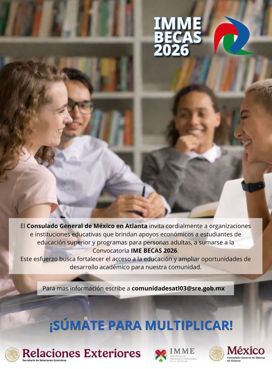 La Secretaría de Relaciones Exteriores, a través del Instituto de las Mexicanas y los Mexicanos en el Exterior (IMME) y su red de consulados en Estados Unidos de América, convocan a instituciones educativas y organizaciones sociales interesadas en participar en IME-Becas para obtener estímulos económicos destinados a estudiantes mexicanos o de origen mexicano matriculados en alguno de sus planes académicos bajo las siguientes dos modalidades: Educación Superior y Educación para Adultos.