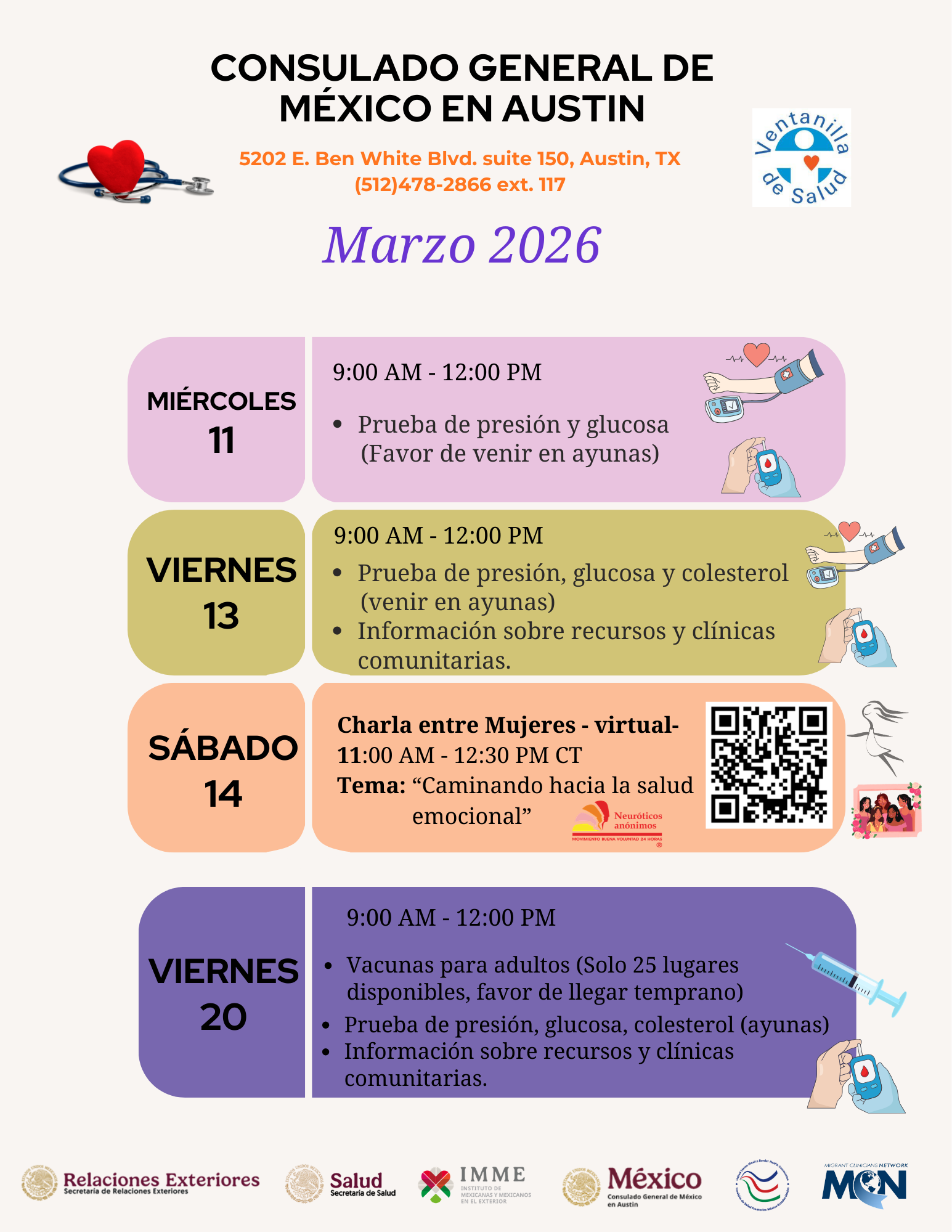 Calendario Ventanilla de Salud - Marzo 2026 ¡Cuida tu salud! Consulta el calendario de la Ventanilla de Salud del Consulado. ¡Te esperamos!