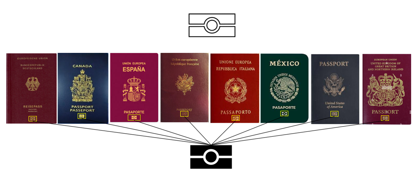 Todos los pasaportes electrónicos tienen en la parte inferior media de la portada un símbolo que lo identifica como un pasaporte electrónico: