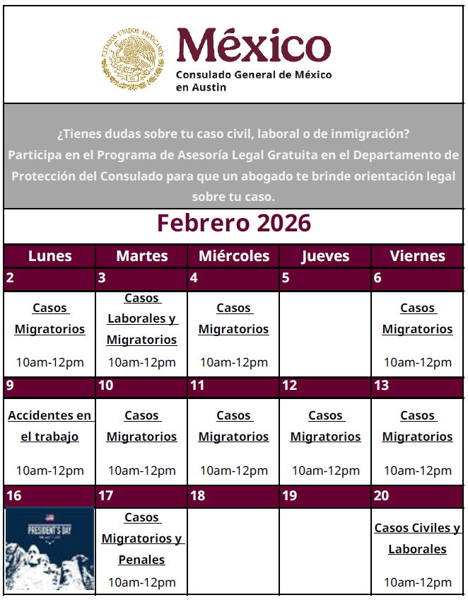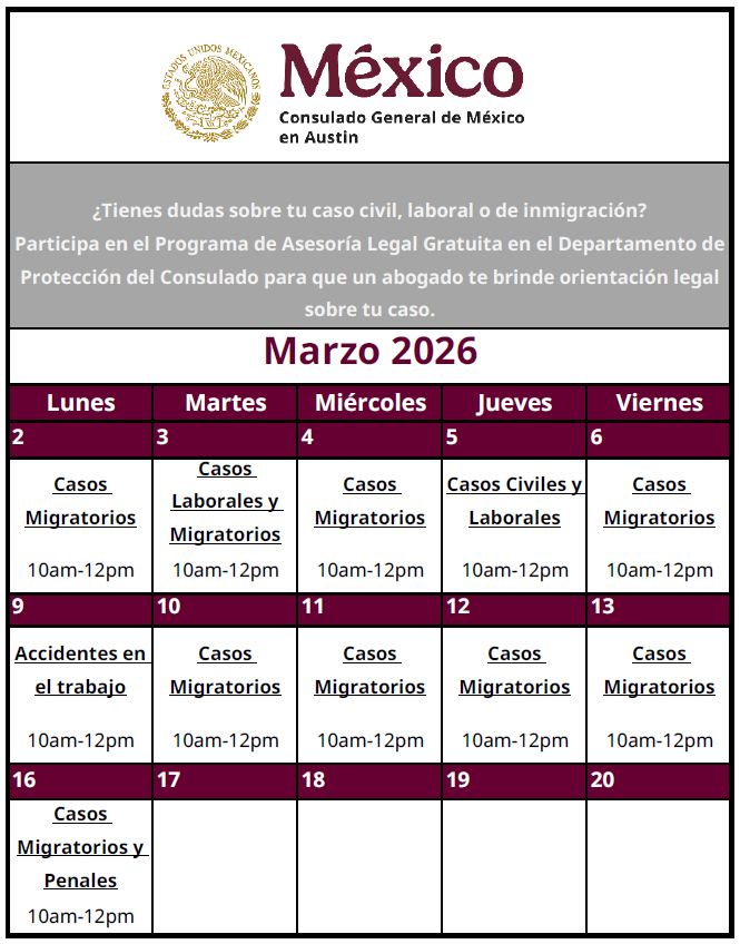 Participa en el Programa de Asesoría Legal Gratuita y Pláticas Informativas en el Departamento de Protección del Consulado. Revisa el calendario y acude SIN cita para recibir orientación en materia migratoria, laboral y civil; todas las asesorías se llevarán a cabo de 10 am – 12 pm.