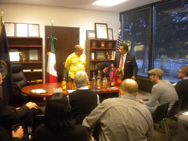 En el marco de las actividades de promoción comercial que realiza el Consulado de México en Boise, el jueves 01 de diciembre de 2011 se realizó una degustación de mezcal presidida por el Cónsul Ricardo Pineda y Sergio Inurrigaro, Presidente de la Asociación Pro-Cultura del Mezcal. Los asistentes incluyeron dueños y gerentes de restaurantes locales, quienes tuvieron la oportunidad de degustar una variedad de mezcales. |