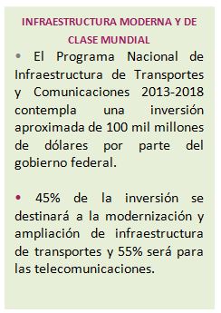 En la actualidad, México ofrece múltiples oportunidades, gracias al compromiso del gobierno del presidente Enrique Peña Nieto por promover reformas que mejoren el ambiente económico del país. Por esta razón, el gobierno federal ha delineado cinco objetivos fundamentales: construir un México en paz, promover un México más inclusivo, con más educación de calidad, más próspero y consolidar al país como un actor global responsable.