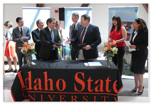 En el marco de FOBESII y como parte de la Iniciativa Proyecta 100,000 la Universidad Autónoma de Ciudad de Juárez (UACJ) y Idaho State University (ISU) firmaron, el pasado día 11 de julio en el campus Meridian de ISU, un acuerdo de cooperación que permitirá a estudiantes e investigadores de ambas instituciones participar en proyectos académicos comunes e intercambios de todo tipo. En una primera etapa, la UACJ ofrecerá 25 becas para estudiantes de medicina de ISU, quienes viajarán a Ciudad Juárez para realizar prácticas profesionales en el ámbito de la medicina comunitaria. En reciprocidad, ISU contribuirá con un número similar de becas para que alumnos y personal académico de la UACJ perfeccionen sus habilidades en el idioma inglés y se beneficien de otros programas diseñados para estudiantes extranjeros. El Presidente de ISU, Arthur Vailas y el Secretario Académico de la UACJ, Manuel Loera, en representación del Rector Ricardo Duarte, coincidieron en la importancia de este instrumento para fortalecer la competitividad y la innovación en América del Norte. De igual forma, expresaron confianza en el potencial de la cooperación entre instituciones de educación superior, en particular para consolidar una sociedad del conocimiento que siga enriqueciendo la relación México-Estados Unidos y la rica plataforma de cooperación que la sustenta en los más diversos ámbitos.
