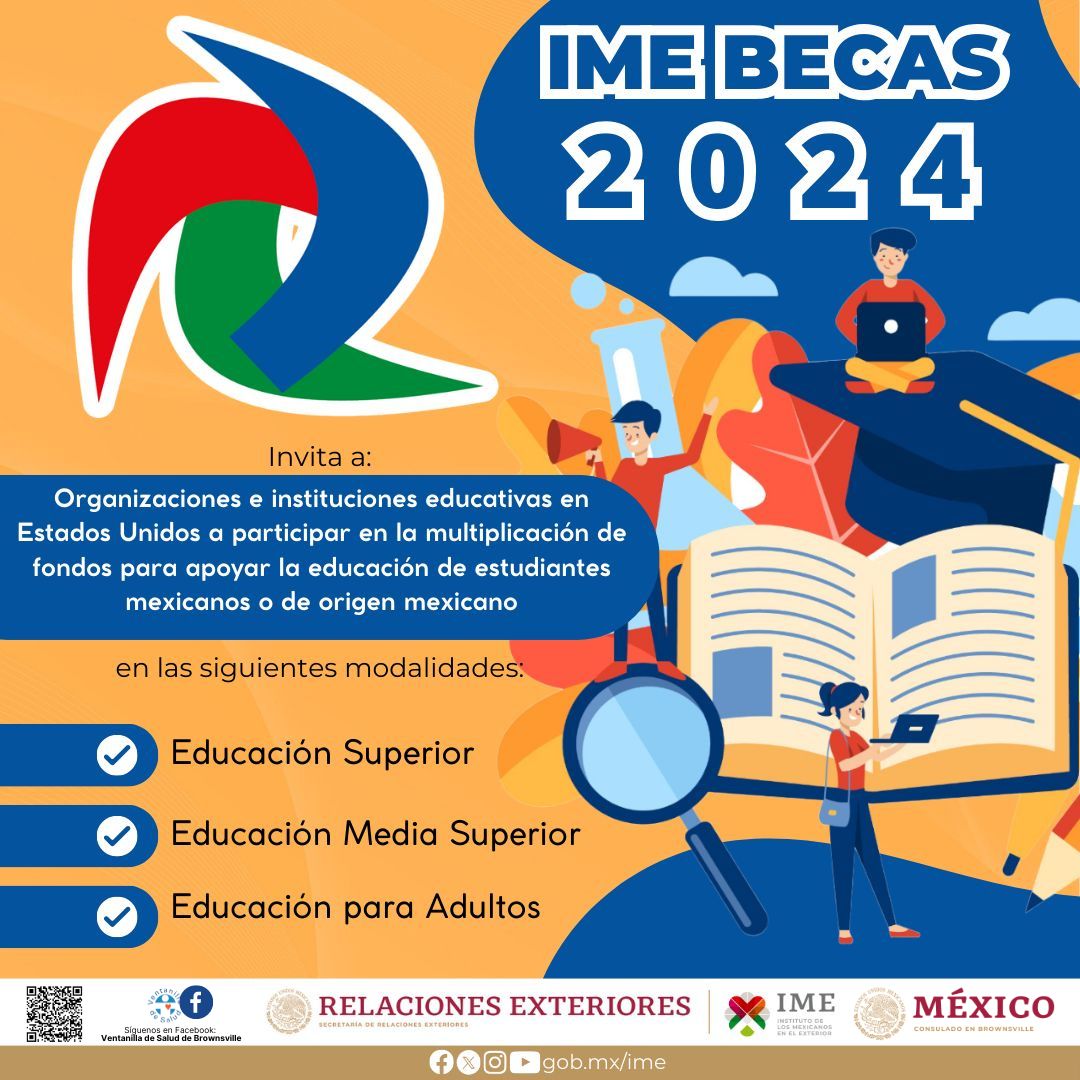 El Consulado de México en Brownsville, Texas, con el apoyo de la Secretaría de Relaciones Exteriores a través del Instituto de los Mexicanos en el Exterior (IME), convoca a instituciones educativas y organizaciones sociales interesadas en participar en IME-Becas para obtener estímulos económicos destinados a personas mexicanas o de origen mexicano matriculadas en alguno de sus planes académicos bajo los siguientes niveles educativos: