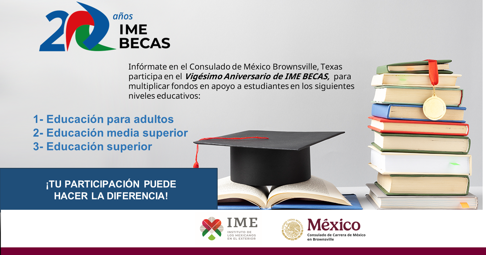 El Consulado de México en Brownsville, Texas con el apoyo de la Secretaría de Relaciones Exteriores a través del Instituto de Mexicanas y Mexicanos en el Exterior, convoca a instituciones educativas y organizaciones sociales interesadas en participar en IME-Becas 2025 para obtener estímulos económicos destinados a personas mexicanas o de origen mexicano matriculadas en alguno de sus planes académicos, en los siguientes niveles educativos: