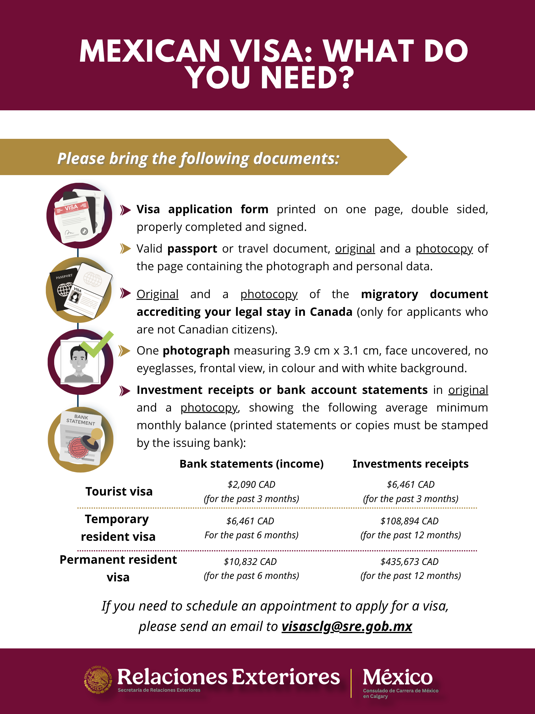 - Original and a photocopy of bank account statements showing sufficient resources to support the applicant in Mexico, from the interested party or his/her parents in the case of applicants under the age of 25. These bank accounts or investments must show a minimum average monthly balance of $21,760.00 Canadian dollars during the past three months.