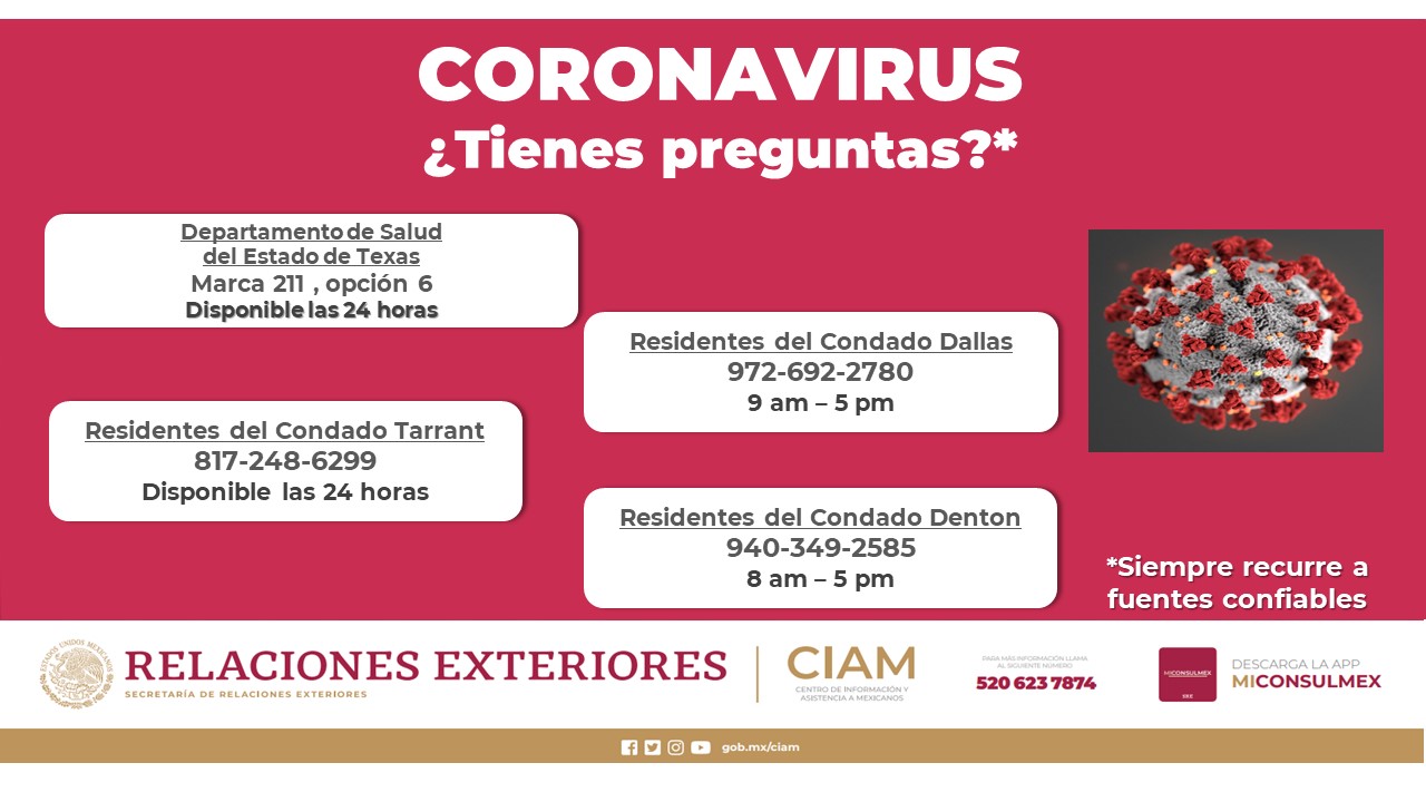 1. Suspensión de actividades en Consulmex Dallas por disposición de autoridades de SaludEn atención a las disposiciones locales, estatales y federales, se suspende la atención al público a partir del martes 17 de marzo. Teléfono de emergencia de protección consular. 214 621 0198. |