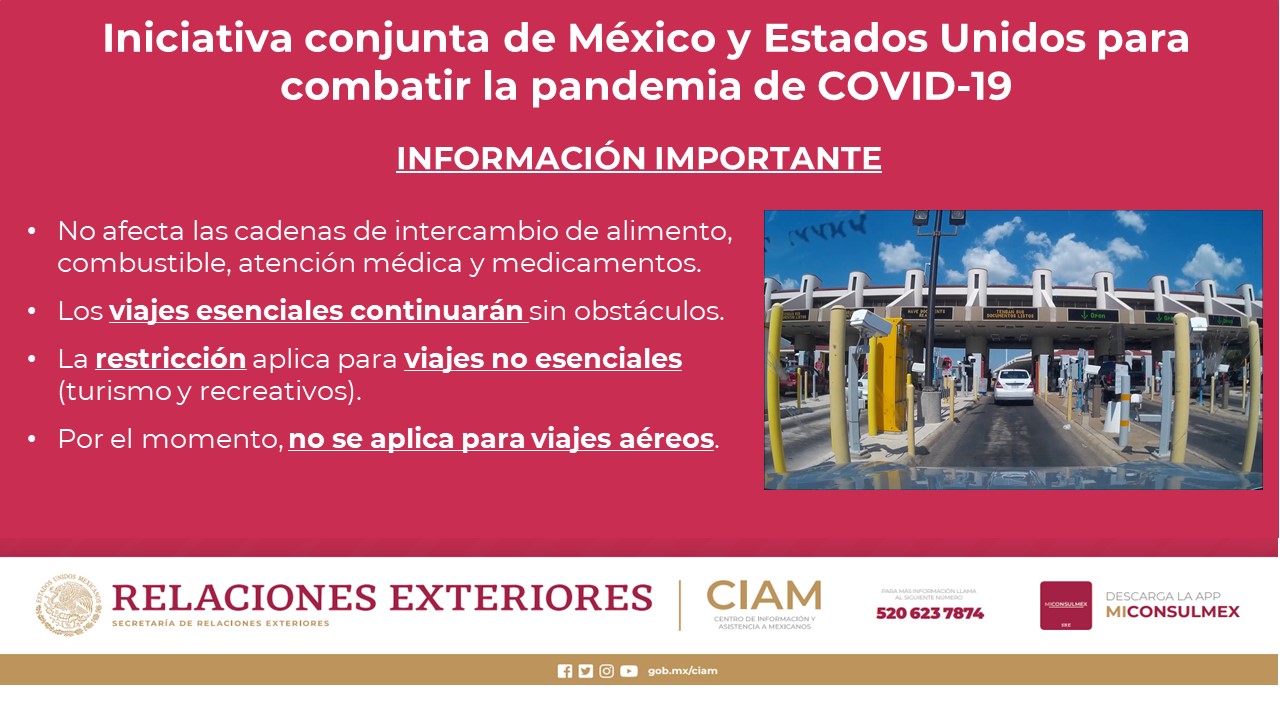 9. Mensaje a la comunidad - Martes 7 de abril de 2020Por disposición de autoridades de Salud local, la ordenanza Stay Home se prolonga hasta el 30 de abril. Asimismo, se recomienda NO realizar viajes a México si no son necesarios debido a COVID19. |