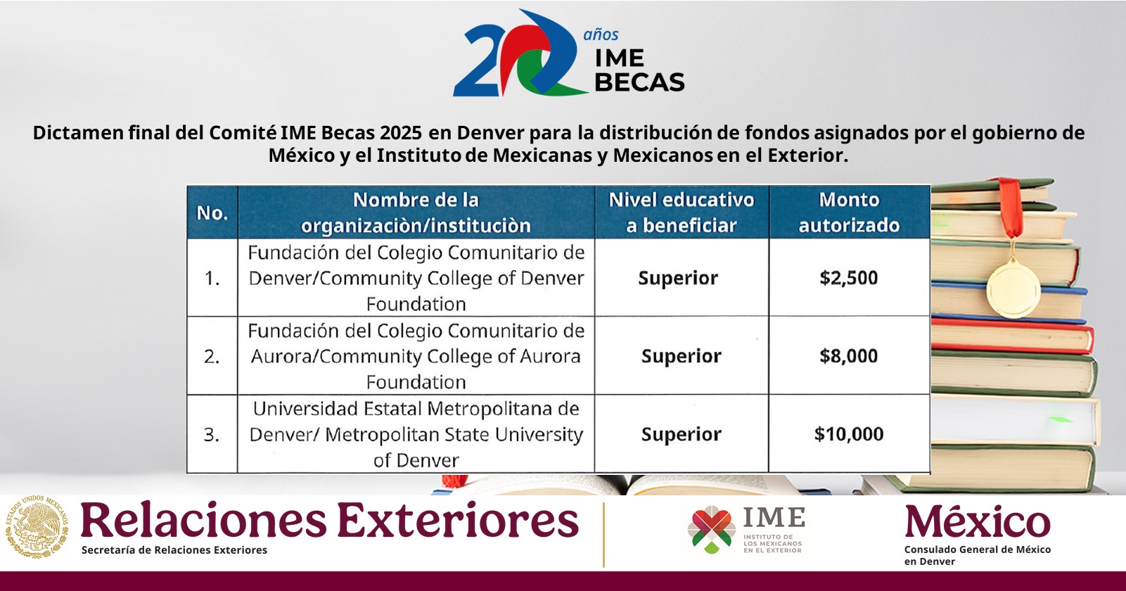 In accordance with IME Scholarships 2025 Call, on May 12, 2025, IME Scholarships 2025 Denver Local Committee issued its final decision for the distribution of funds, allocated by the government of Mexico and the Institute of Mexicans Abroad to the following institutions of higher education in Colorado that participated in this call. Thank you very much for your support and for strengthening this program for the benefit of Mexican students.