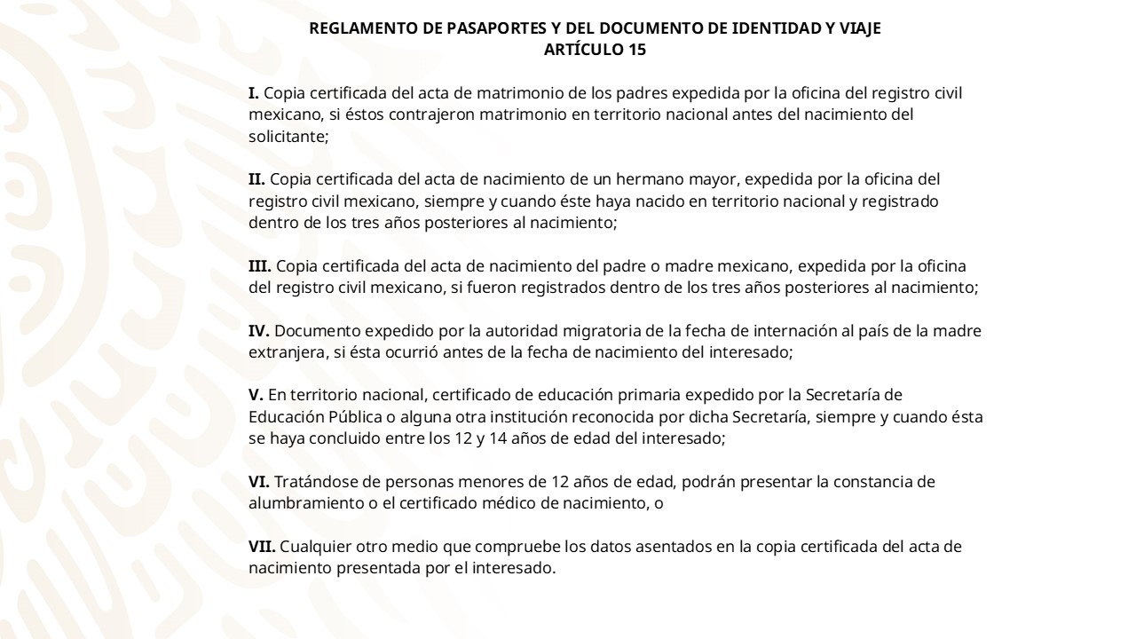 Tanto los padres como el niño o niña menor de edad, deberán de comparecer personalmente el día de la cita. En caso de que alguno de los padres no pueda acudir, deberá de otorgar su consentimiento previamente en una oficina de pasaportes o consular. Favor de verificar el apartado de “Permiso a distancia de padres para un pasaporte de un menor de edad (OP7-II)”. Es importante precisar que sin el consentimiento de ambos padres, el trámite no podrá realizarse. 1. Original y copia de la identificación oficial vigente de los padres. Pueden presentar cualquiera de los siguientes documentos: 2. Original y copia del pasaporte a renovar de la persona menor de edad. 3. Copia certificada del acta de nacimiento expedida por el Registro Civil/Oficina Consular O acta impresa a través del siguiente portal gubernamental: https://www.miregistrocivil.gob.mx/ *Requisitos adicionales (de ser el caso): -Si alguna de las personas facultadas para otorgar el consentimiento falleció, se debe presentar copia certificada del acta de defunción emitida por la oficina del Registro Civil/oficina Consular O acta impresa a través del siguiente portal gubernamental: https://www.miregistrocivil.gob.mx/ -Si alguna de las personas progenitoras ha perdido o tiene suspendida la patria potestad, la persona que la ejerza en exclusiva deberá presentar copia certificada de la sentencia y del auto en que causó ejecutoria, emitida por tribunales mexicanos. -Si alguno de los padres se niega a otorgar el consentimiento, se debe de presentar copia certificada de la sentencia en la que el juez suple el consentimiento y del auto en que causó ejecutoria, emitida por tribunales mexicanos. -Si el pasaporte de la persona menor de edad está vencido desde hace más de 7 años, se le solicita nos envíe un correo electrónico a la siguiente dirección: Esta dirección de correo electrónico está siendo protegida contra los robots de spam. Necesita tener JavaScript habilitado para poder verlo. Vigencia del pasaporte: La vigencia de los pasaportes será de 1 ó 3 años para los menores de 3 años de edad y de 3 a 6 años para los menores de edad que tengan entre 3 y 18 años.