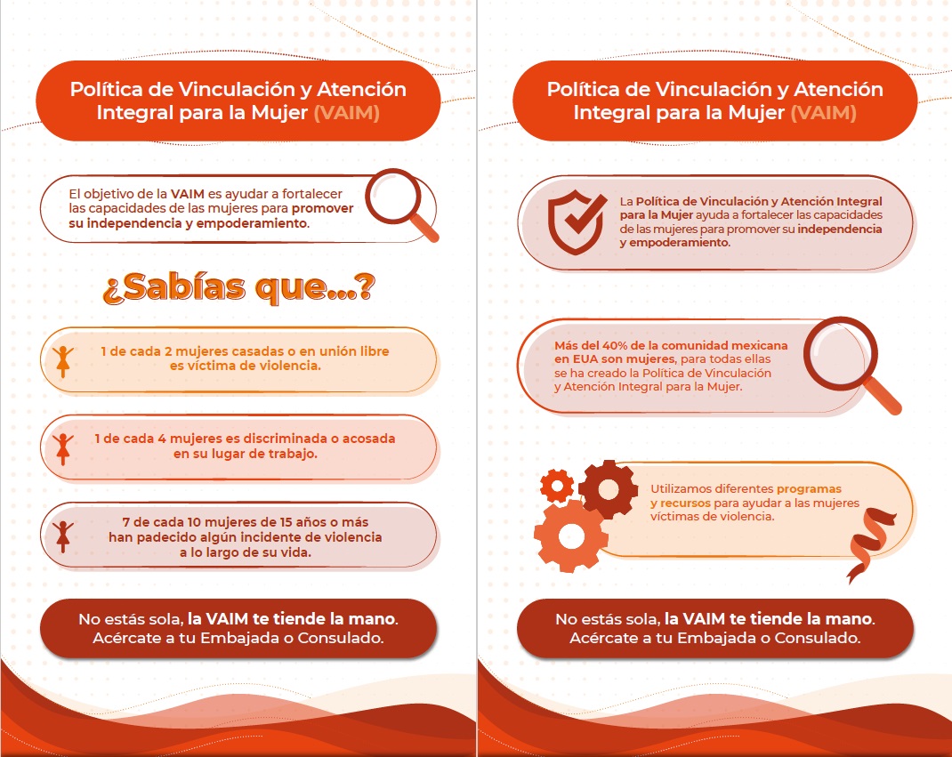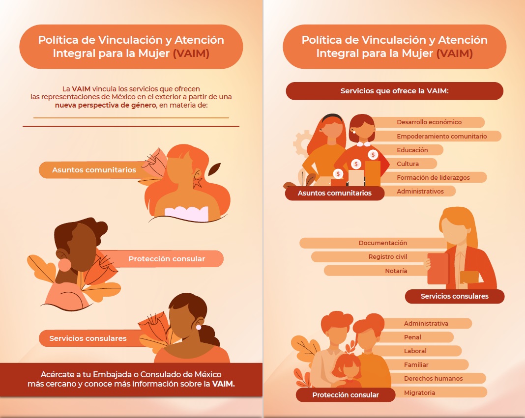 La Política de Vinculación y Atención Integral para la Mujer (VAIM) brinda atención consular multidisciplinaria, con el propósito de proteger los derechos de la mujer migrante y facilitar las herramientas necesarias para su empoderamiento. A través de la VAIM se implementan acciones y servicios de asistencia y atención a mujeres y niñas en situación de violencia o abuso. Los Consulados y Embajadas de México son Zonas Seguras.