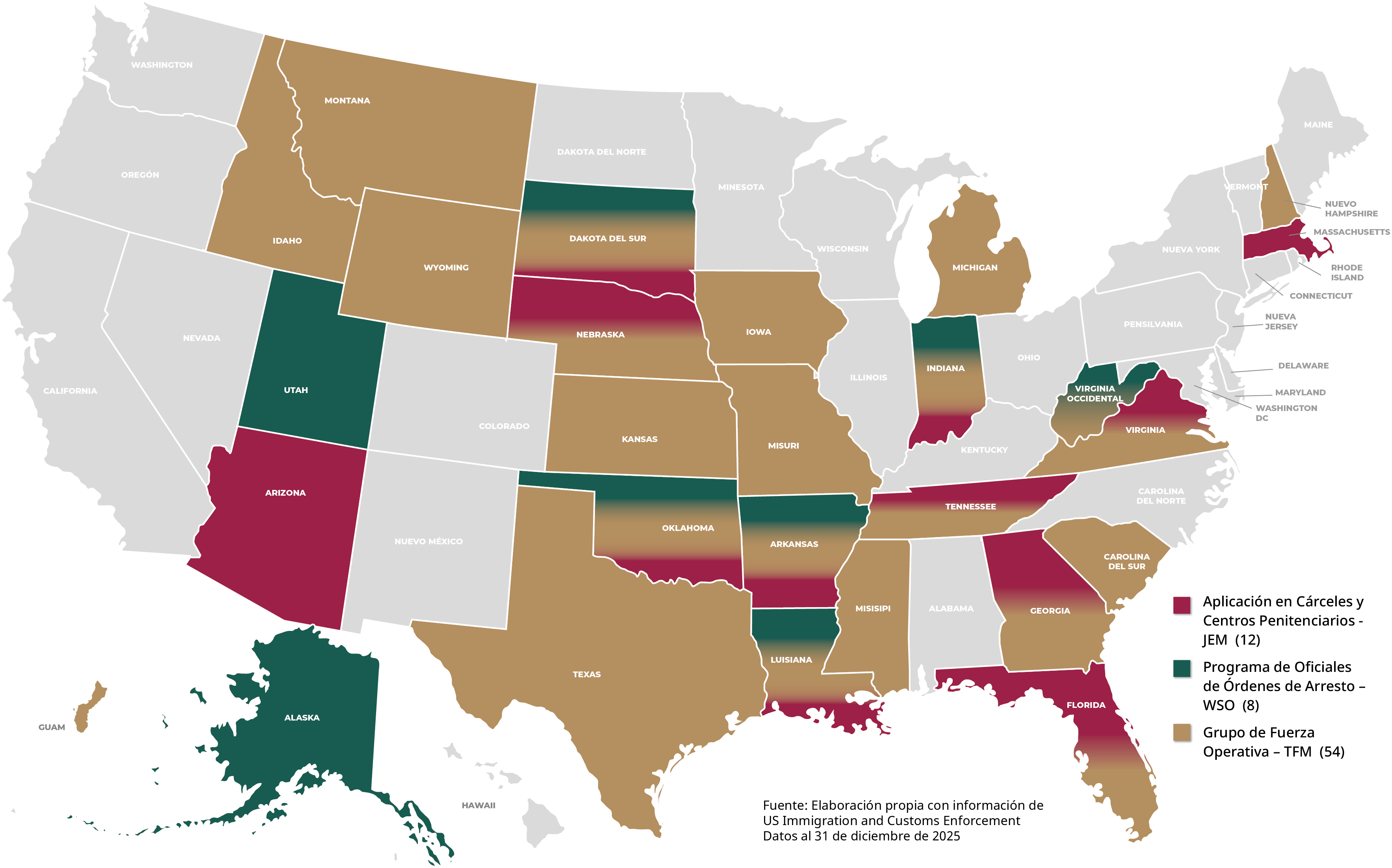 Al 1 de enero de 2026, el Observatorio de Leyes y Medidas Antiinmigrantes tiene registrados 1,274 acuerdos 287(g) con cobertura en 40 estados: