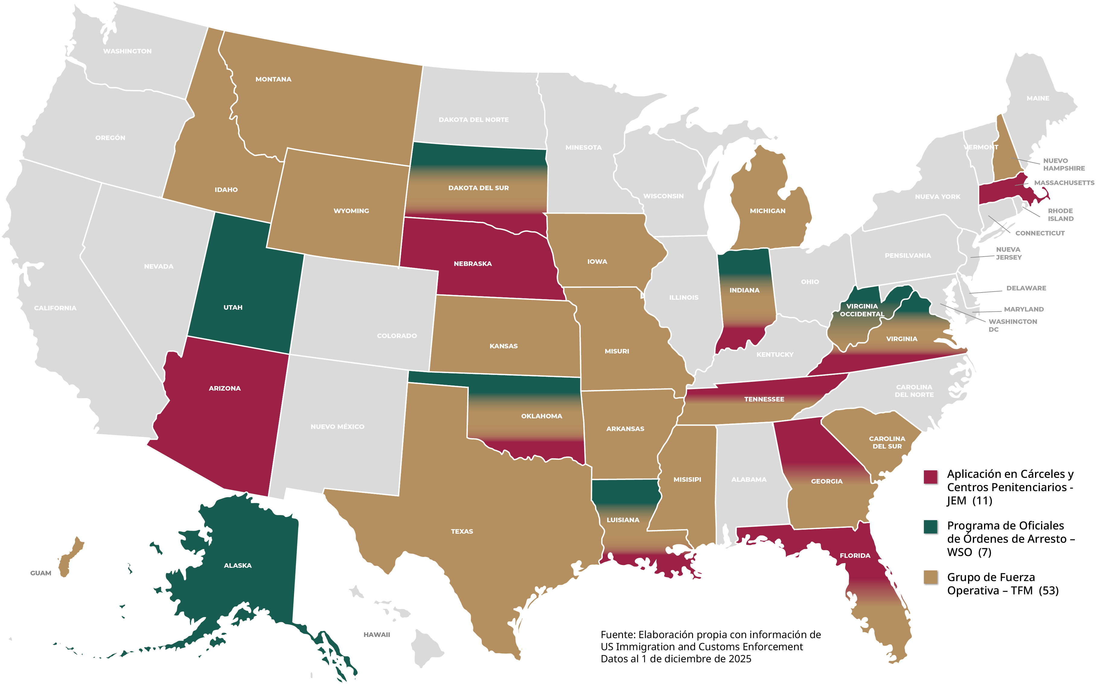 Al 1 de diciembre de 2025, el Observatorio de Leyes y Medidas Antiinmigrantes tiene registrados 1,096 acuerdos 287(g) con cobertura en 40 estados: