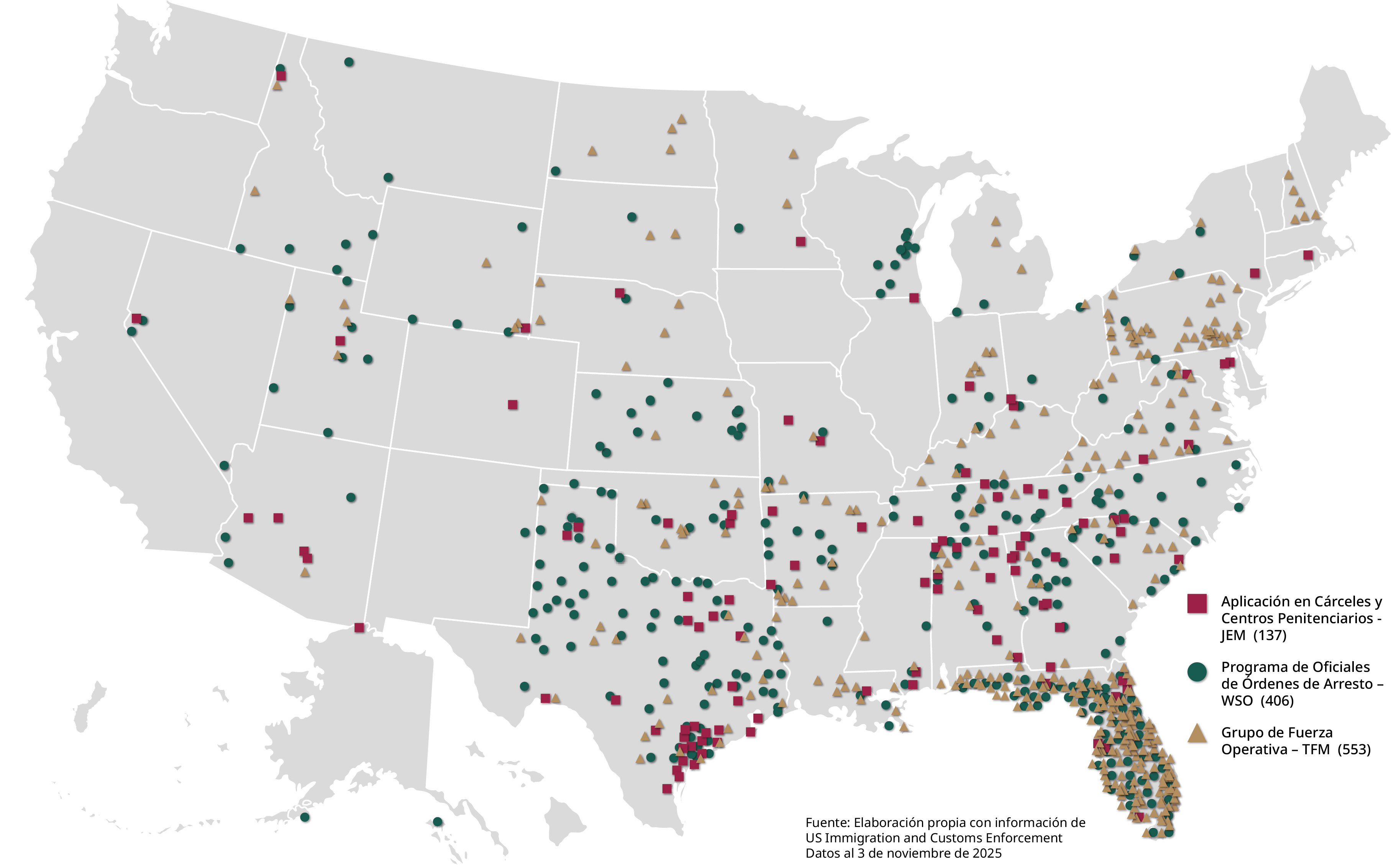 - En este programa, ICE capacita y autoriza a oficiales locales para ejecutar órdenes administrativas de arresto dentro de las instalaciones carcelarias de su jurisdicción. A diferencia del modelo JEM, los oficiales en el programa WSO no están autorizados a interrogar a los detenidos sobre su estatus migratorio; su función se limita a ejecutar las órdenes emitidas previamente por ICE.