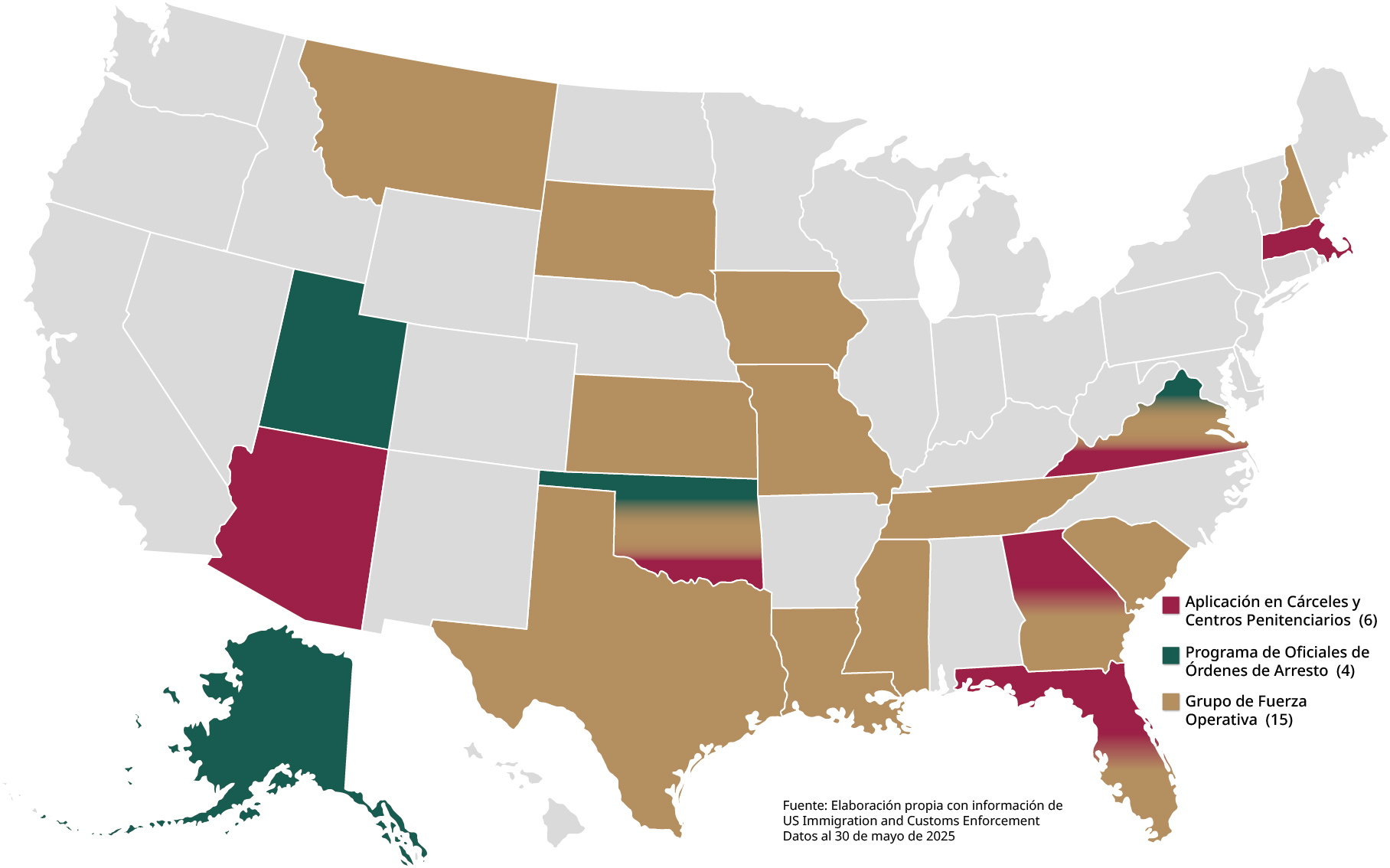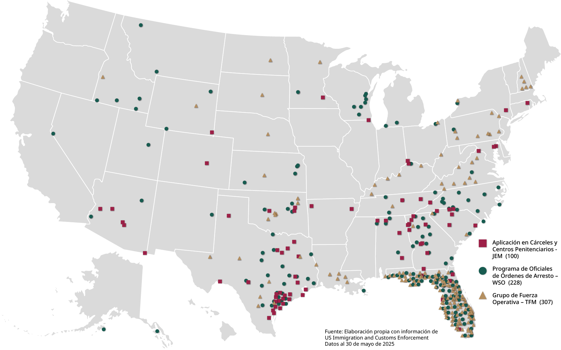 Al 30 de mayo de 2025, el Observatorio de Leyes y Medidas Antiinmigrantes tiene registrados 635 acuerdos 287(g) con cobertura en 40 estados: