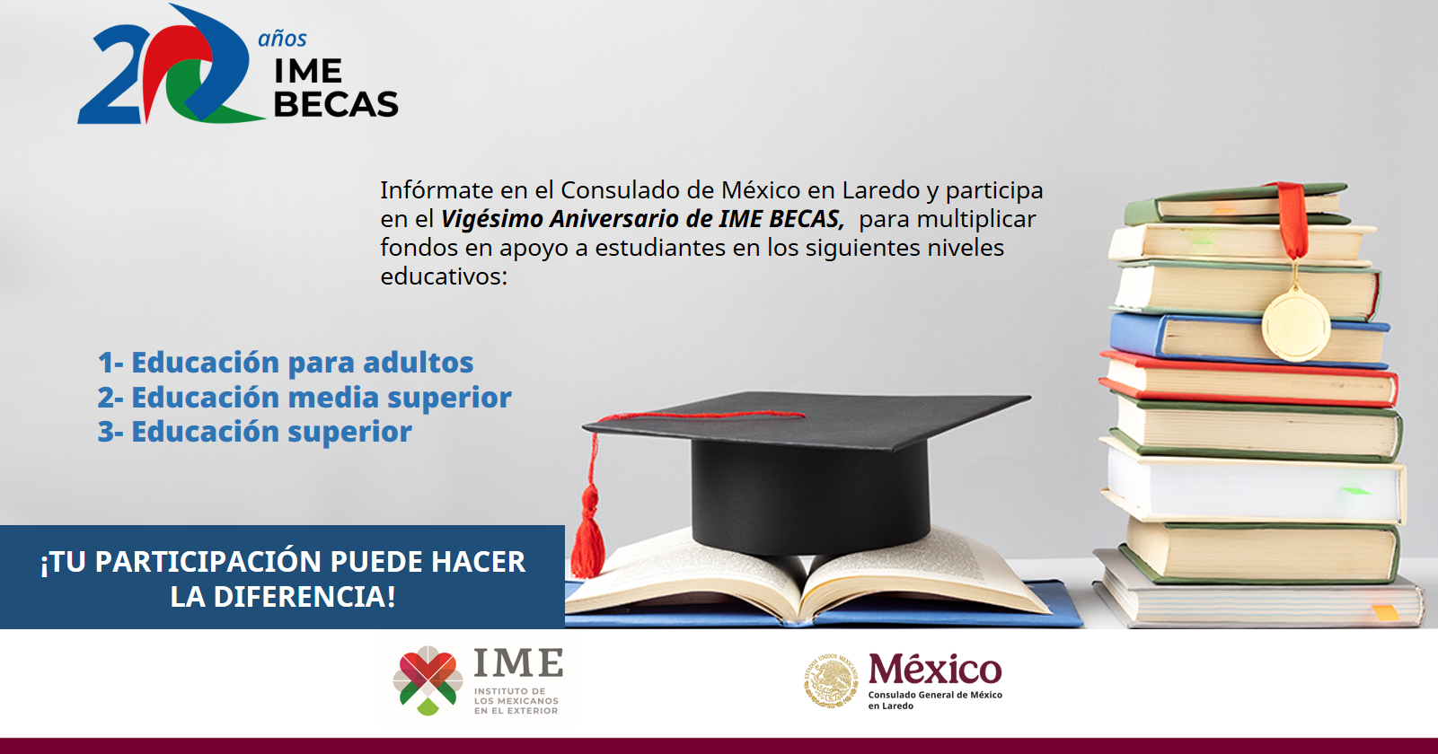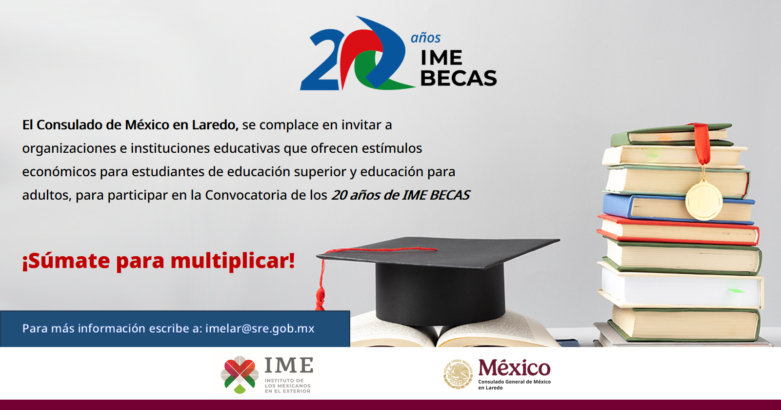 El Consulado General de México en Laredo, con el apoyo de la Secretaría de Relaciones Exteriores a través del Instituto de los Mexicanos en el Exterior (IME), convoca a instituciones educativas y organizaciones sociales interesadas en participar en IME-Becas para obtener estímulos económicos destinados a personas mexicanas o de origen mexicano matriculadas en alguno de sus planes académicos.