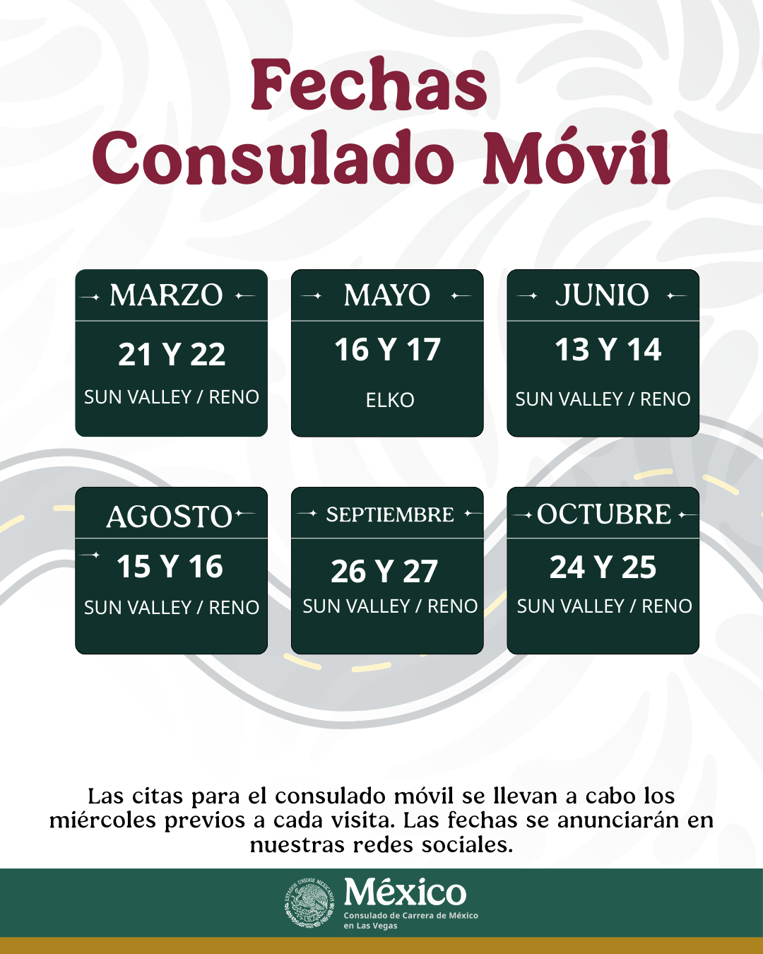PROGRAMA DE CONSULADO MÓVILLos Consulados de México en Estados Unidos cuentan con un programa llamado Consulado Móvil, que se desarrolla a través de visitas generalmente realizadas durante los fines de semana a las comunidades mexicanas que se encuentran en zonas alejadas de la sede consular. LOS SERVICIOS SON ÚNICAMENTE CON CITA Los Consulados Móviles tienen como propósitos principales: