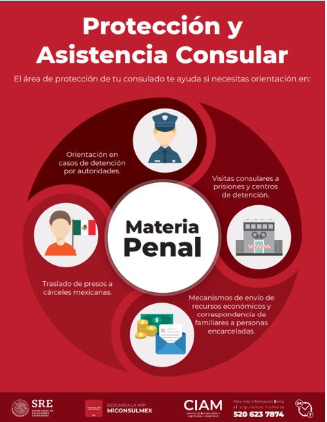 Objetivo: Orientar a personas mexicanas detenidas o a sus familiares sobre el proceso legal que seguirán y cerciorarse que se respete su integridad y sus derechos humanos. Asimismo, se brinda información sobre sus relaciones con la autoridad local.