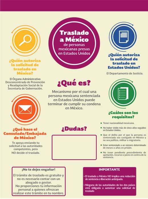 La asesoría brindada por el Consulado es de carácter informativo y en ningún caso sustituye la asesoría legal de un abogado. El gobierno de México no tiene la capacidad para modificar sentencias, liberar prisioneros, ni solicitar unilateralmente la repatriación de una persona mexicana que cumple su sentencia en una prisión en Estados Unidos.