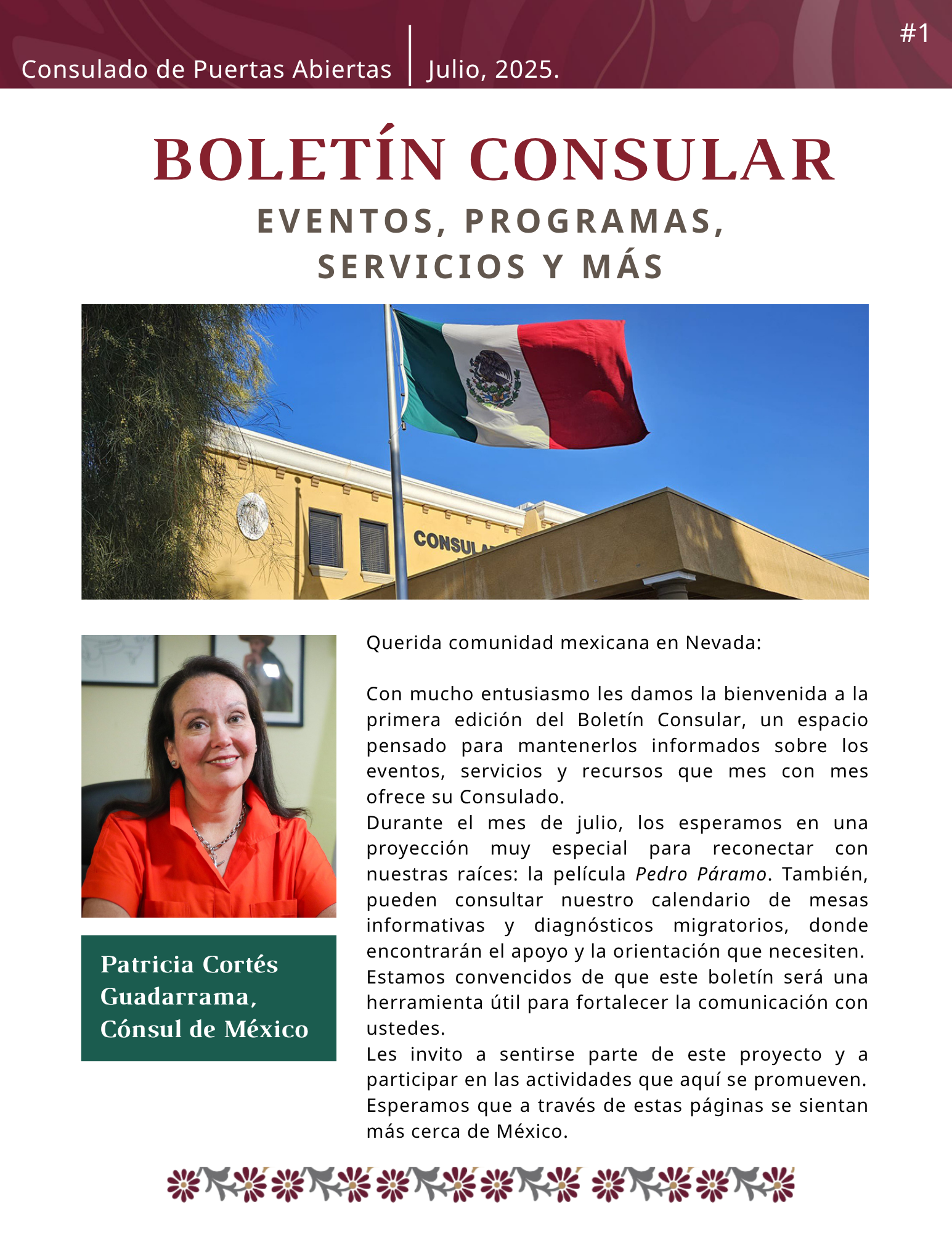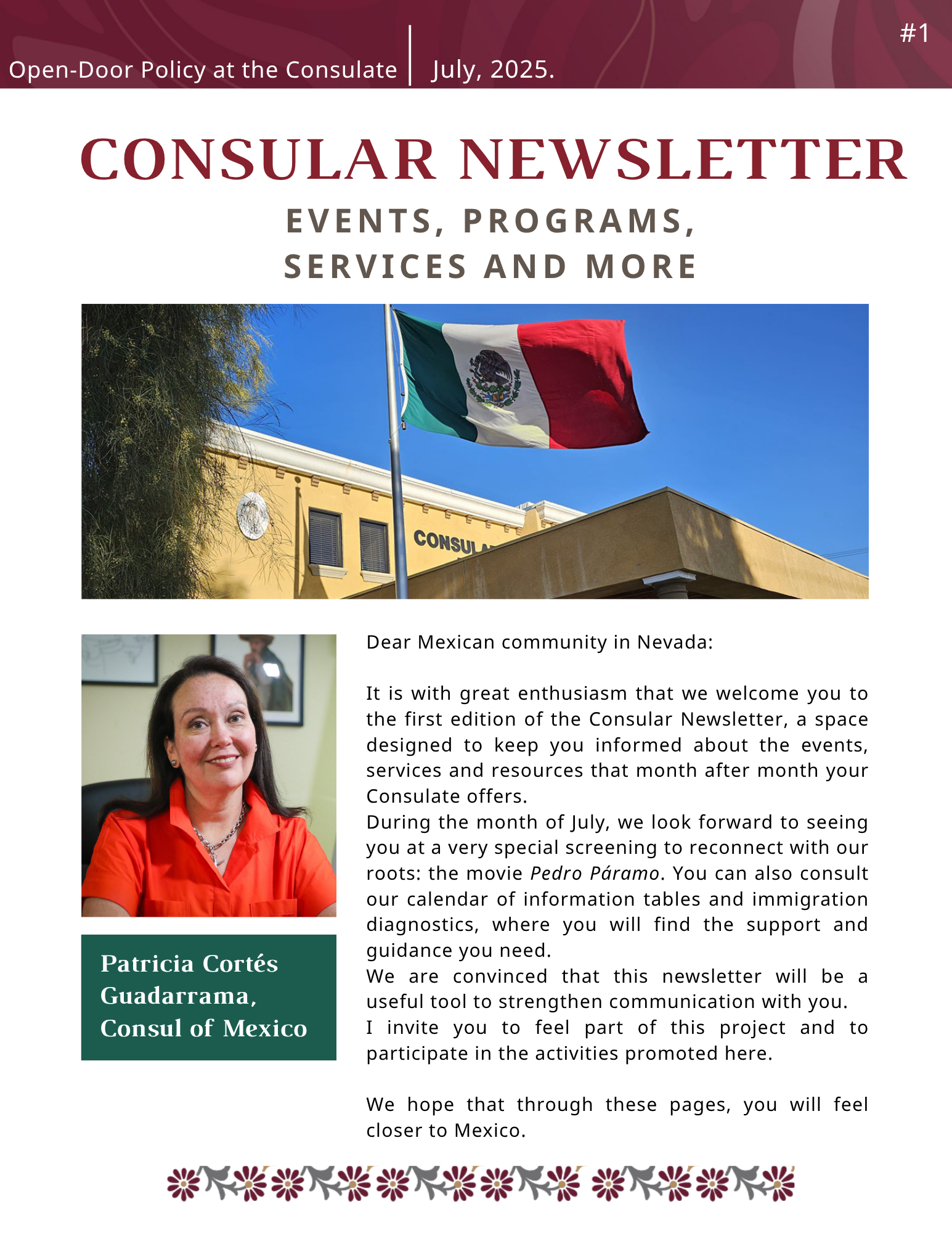 The Mexican Consulate in Las Vegas is pleased to announce the first edition of its newsletter. This digital edition will be published every two months. Readers will find information about upcoming events, as well as relevant information about consulate services, including appointment scheduling and dual citizenship. You will also be able to meet community members and learn about various resources. We invite you to read and share it! We also invite you to contribute to the newsletter. Contact us at Esta dirección de correo electrónico está siendo protegida contra los robots de spam. Necesita tener JavaScript habilitado para poder verlo..
