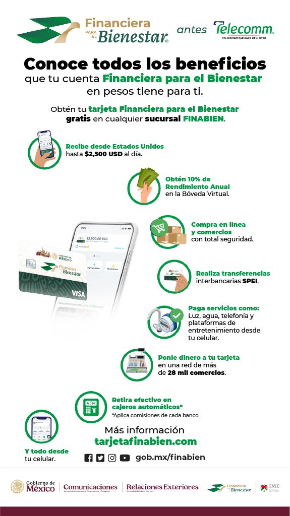 El programa “Tarjetas FINABIEN” de Financiera para el Bienestar (FINABIEN) tiene el propósito de ofrecer la comunidad mexicana en una opción de envío de dinero a México de manera fácil, rápida y segura, con una comisión baja, competitiva y en cuestión de segundos, mediante el uso de una aplicación de celular que permite tener dos cuentas y dos tarjetas, una en dólares y otra en pesos. De igual forma, les permite realizar depósitos, retiros, cobro de programas sociales y contar con un medio de pago nacional e internacional.