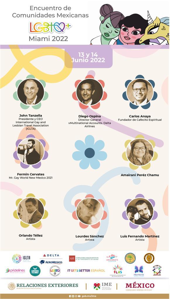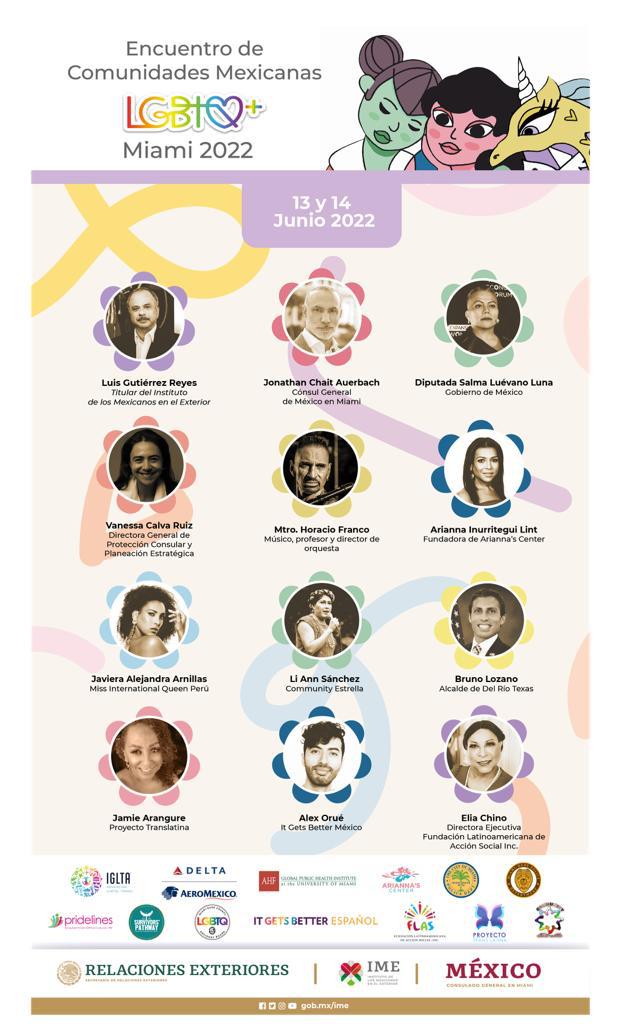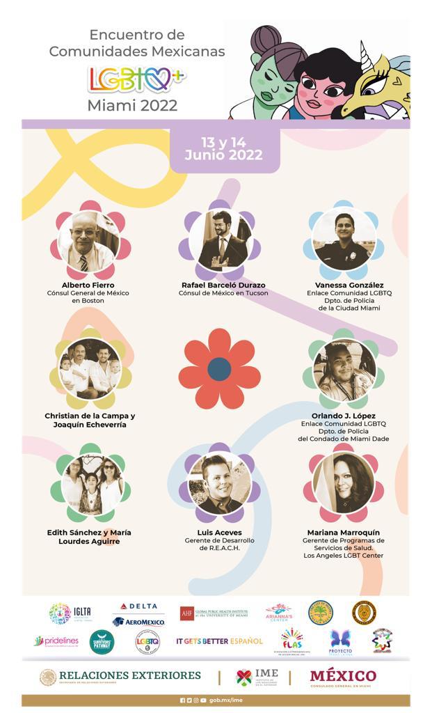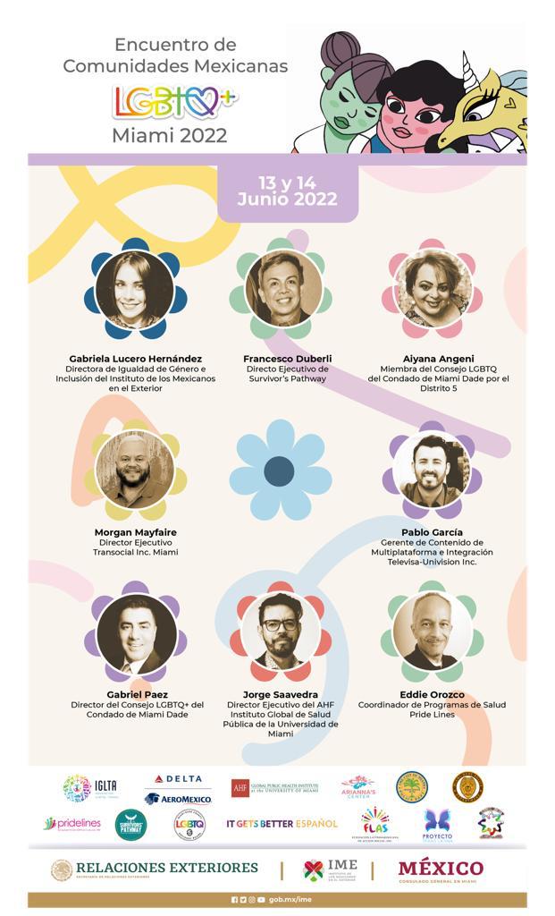 El 13 y 14 de junio el Instituto de los Mexicanos en el Exterior (IME), de la Secretaría de Relaciones Exteriores (SRE) y el Consulado General de México en Miami realizarán de manera presencial y virtual el “Encuentro de comunidades mexicanas LGBTQ+ en el exterior en Miami, Florida”, con el objetivo de crear, vincular y fortalecer redes de apoyo entre la comunidad migrante LGBTQ+, además de promover y fortalecer los servicios comunitarios y consulares que el gobierno de México pone a su disposición a través de sus Representaciones diplomáticas y consulares en el exterior en el marco de una política de “Zona Segura”.