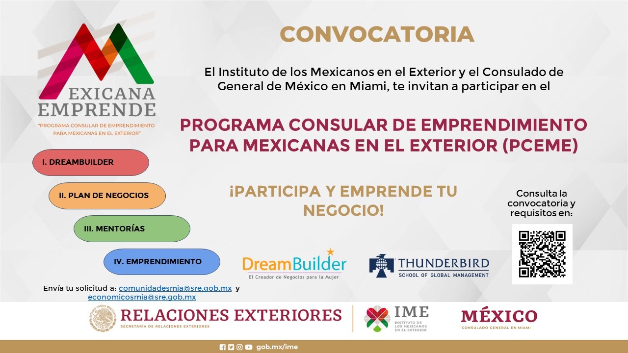 El Consulado de General de México en Miami, con el apoyo de la Escuela de Administración Global Thunderbird, invitan a participar en la “Tercera edición del Programa Consular de Emprendimiento para Mexicanas en el Exterior” (PCEME).