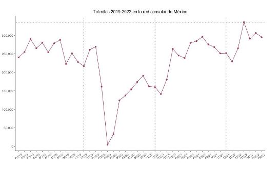 Durante el primer semestre de 2022, la Secretaría de Relaciones Exteriores registró un aumento en la cantidad de trámites atendidos del 28% en comparación con el mismo periodo de 2021 y del 9% en comparación con 2019. En los primeros seis meses del año se atendieron 1,721,803 trámites en la red consular mexicana en el mundo que se distribuyen de la siguiente forma: 804,999 pasaportes (47%); 447,933 matrículas consulares (26%); 130,842 solicitudes de credencial para votar (8%); 95,683 visas (5%); y 242,346 legalizaciones, trámites de fe pública, registro civil y otros (14%).