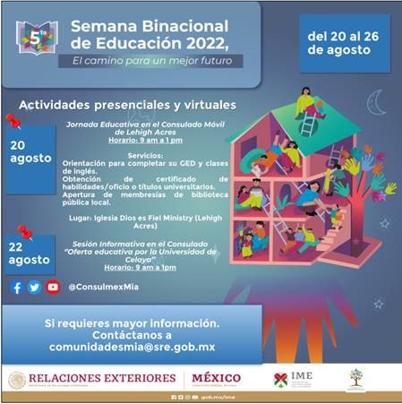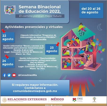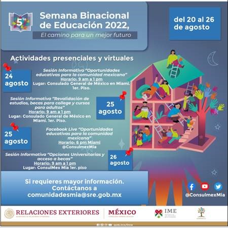 Para mayor información sobre las actividades de la “Semana Binacional de Educación” #SBE2022 los interesados pueden escribir a Esta dirección de correo electrónico está siendo protegida contra los robots de spam. Necesita tener JavaScript habilitado para poder verlo. o llamar al Departamento de Comunidades del Consulado General de México en Miami (786) 268 4884.