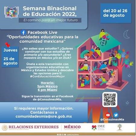 - Facebook Live @ConsulmexMia ‘’Educación para un mejor futuro’’, el jueves 25 de agosto a las 6pm.