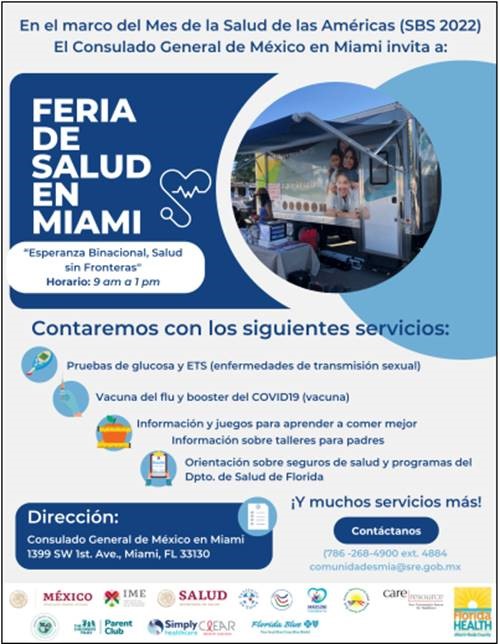 En el marco del Mes de la Salud de las Américas 2022 también se realizará en las instalaciones del Consulado General la “Feria de Salud en Miami” con atención gratuita a través de la Ventanilla de Salud “Fundación Marsoni”. Los interesados deben comunicarse al Departamento de Comunidades (786) 2684900 ext. 4884 o por correo electrónico Esta dirección de correo electrónico está siendo protegida contra los robots de spam. Necesita tener JavaScript habilitado para poder verlo.. Los servicios son:
