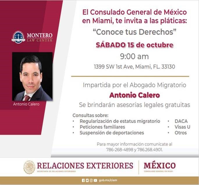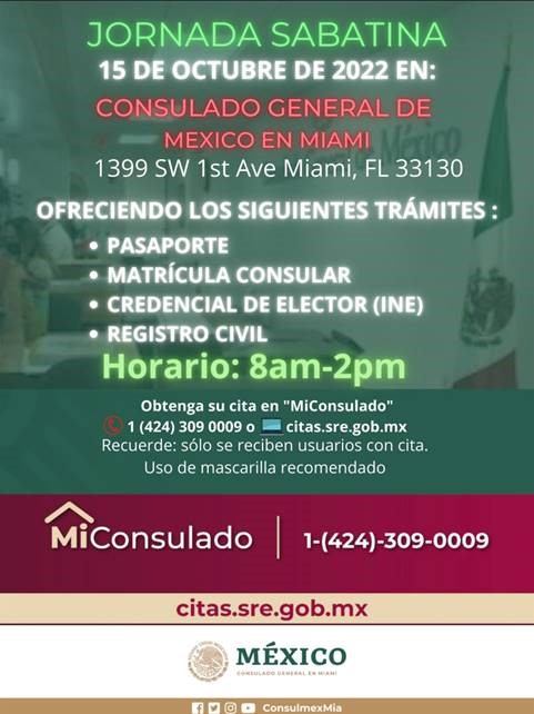 En el marco del programa de “Jornadas Sabatinas”, el Consulado General de México en Miami llevará a cabo una jornada de documentación el próximo sábado 15 de octubre, de 8am a 2pm, para brindar servicios de documentación a los connacionales que requieran diversos documentos tales como: