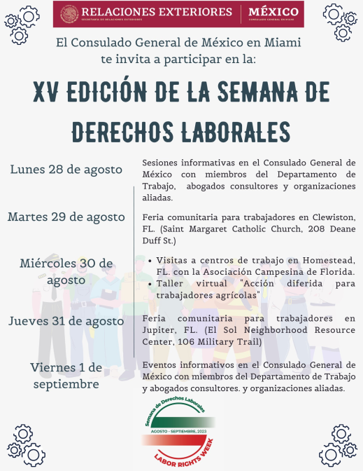 Del 28 de agosto al 1 de septiembre de 2023, se realizará la “XV edición de la Semana de Derechos Laborales” (SDL) con el lema “Ejerce tus derechos laborales” (Exercise your labor rights), una iniciativa del Gobierno de México impulsada en el marco del Día del Trabajo en Estados Unidos (Labor Day).