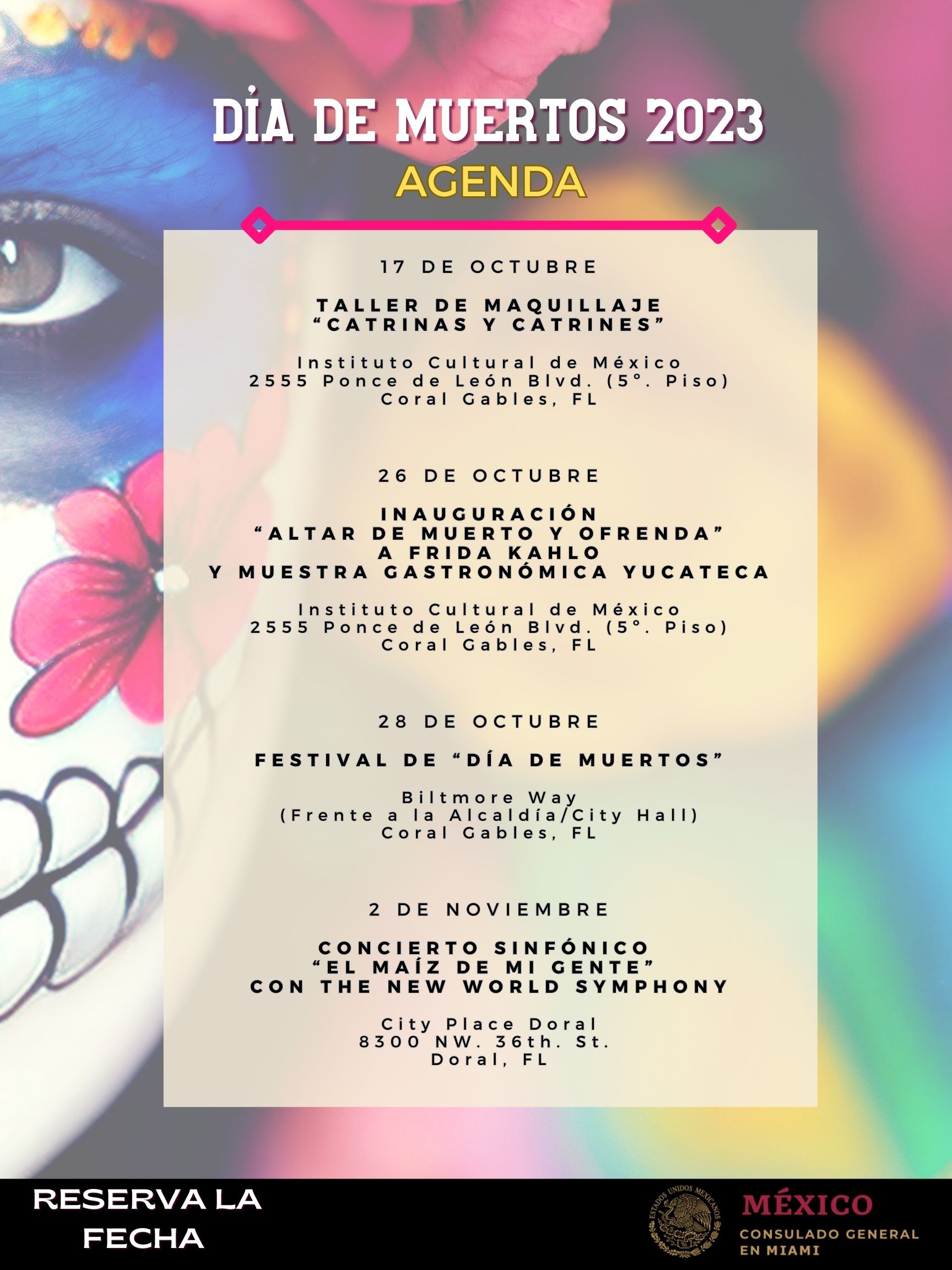 The festivities includes a Catrinas and Catrines contest; indigenous and folkloric dances with Ayala Ballet, Tloke Nahuake, Ameyal and Ballet Folklorico Azteca; Mexican singers Norma Casillas and Julia Vari; the Rockenes group, Mariachi Mi México, and will conclude with a traditional parade. Likewise, visitors will be able to fully experience “Day of the Dead” with the display of crafts, and tastings of Mexico’s cuisine by Mexican entrepreneurs based in South Florida.