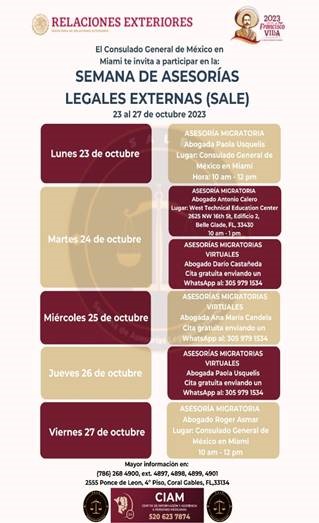 Durante la semana, un abogado experto en la materia brindará asesoría y orientación a la población mexicana residente en el sur de Florida. Para el caso particular de las asesorías virtuales; éstas se llevarán a cabo por videollamada en la plataforma de mensajería WhatsApp y se podrán programar con anticipación.