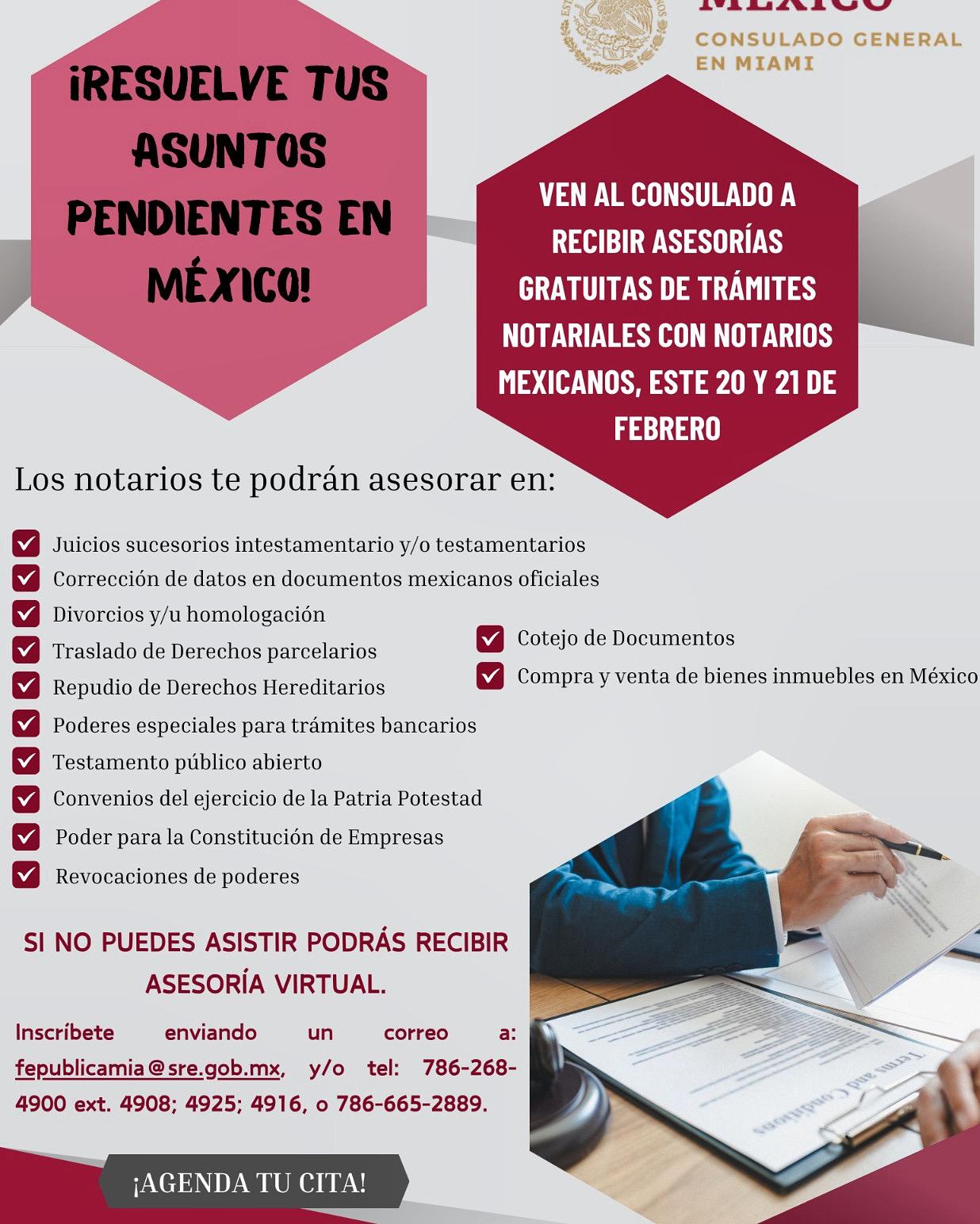 Con el lema ¡Resuelve tus asuntos pendientes en México”, el Consulado General de México en Miami coordinará la visita de un distinguido grupo de Notarios Públicos de nuestro país, que durante los días 20 y 21 de febrero realizarán una gira de trabajo al sur de Florida.