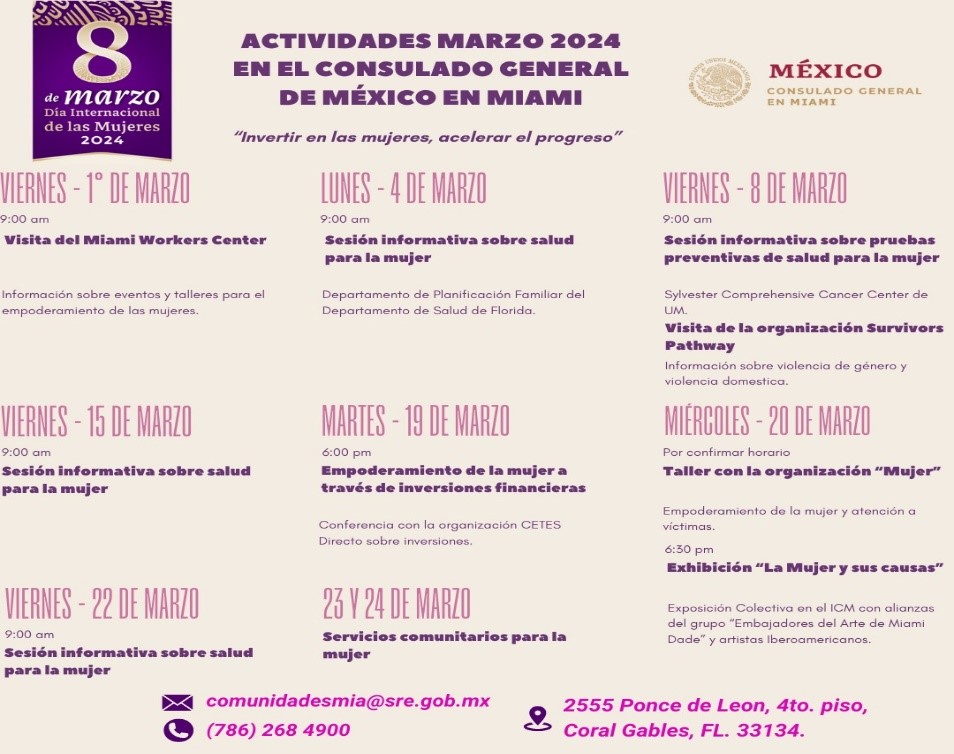 En el marco del Día Internacional de las Mujeres, a conmemorarse el 8 de marzo, el Consulado General de México en Miami presenta una agenda de actividades integrales transversales que resguardan la protección y derechos humanos de las mujeres migrantes mexicanas en el sur de Florida.