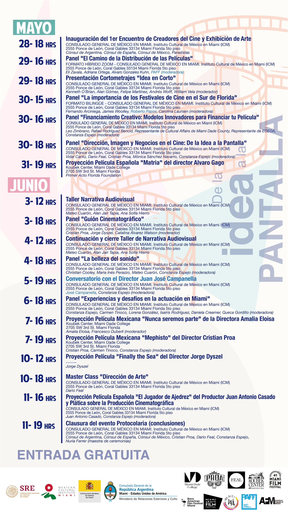 The event will take place from May 28 to June 11, 2024, at various venues throughout Miami. During this period, outstanding films will be screened, round tables will be held with film experts, and workshops and master classes will be held with the participation of Juan José Campanella, Carlos Cuarón, Mateo Curaron, Kennet O'Brian, Cristian Proa, Dario Feal, Vidal Cantú, Jorge Dyszel, Fernando Arciniega, María Inez Perazo, Juan Antonio Casado, Cathy Álvarez, Constanza Espejo, Queca Gordillo, Carolina Laursen, Nuria Ferrer and Roberto Pazos, among others.