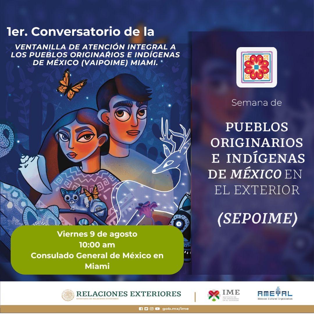 El viernes 9 de agosto, con el apoyo de “Ameyal” (coordinadora de la VAIPOIME en el sur de Florida) realizaremos el Primer Conversatorio de la VAIPOIME Miami -10 am- en las instalaciones del Consulado General de México en Miami, en donde las comunidades mexicanas compartirán sus experiencias y actividades que realizan a través de dicha Ventanilla.