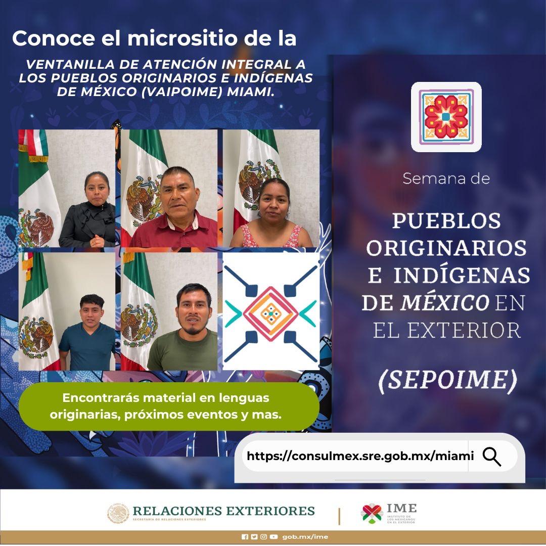 - Consulta nuestro micrositio con información de la SEPOIM: https://consulmex.sre.gob.mx/miami/index.php/3-semana-de-pueblos-originarios-e-indigenas-de-mexico-en-el-exterior