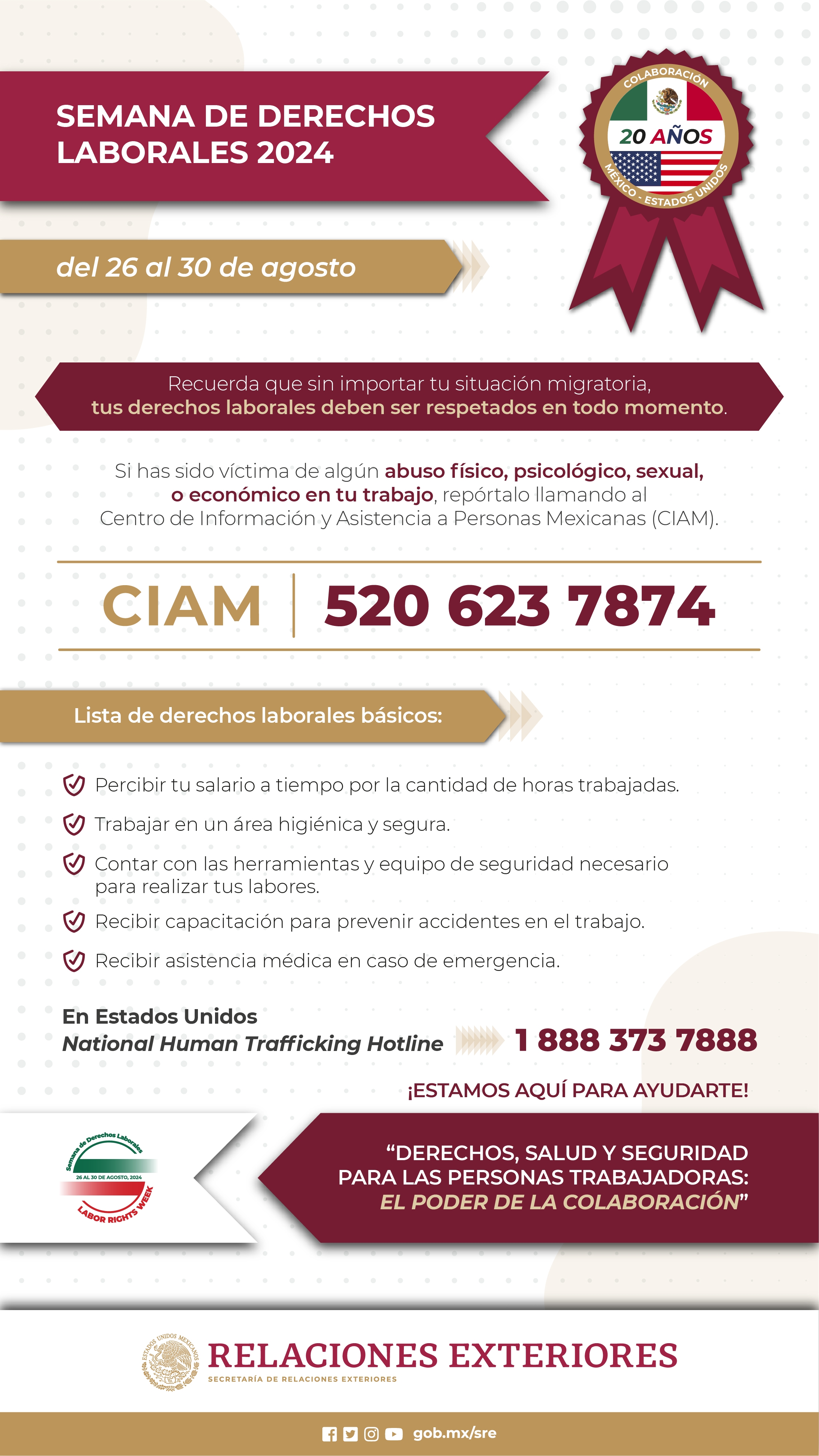 El Consulado General de México en Miami en coordinación con la Red Consular de México en América del Norte llevará a cabo la XVI edición de la Semana de Derechos Laborales #SDL2024 con el lema “Derechos, salud y seguridad para las personas trabajadoras: El poder de la colaboración”, del lunes 26 al viernes 30 de agosto.