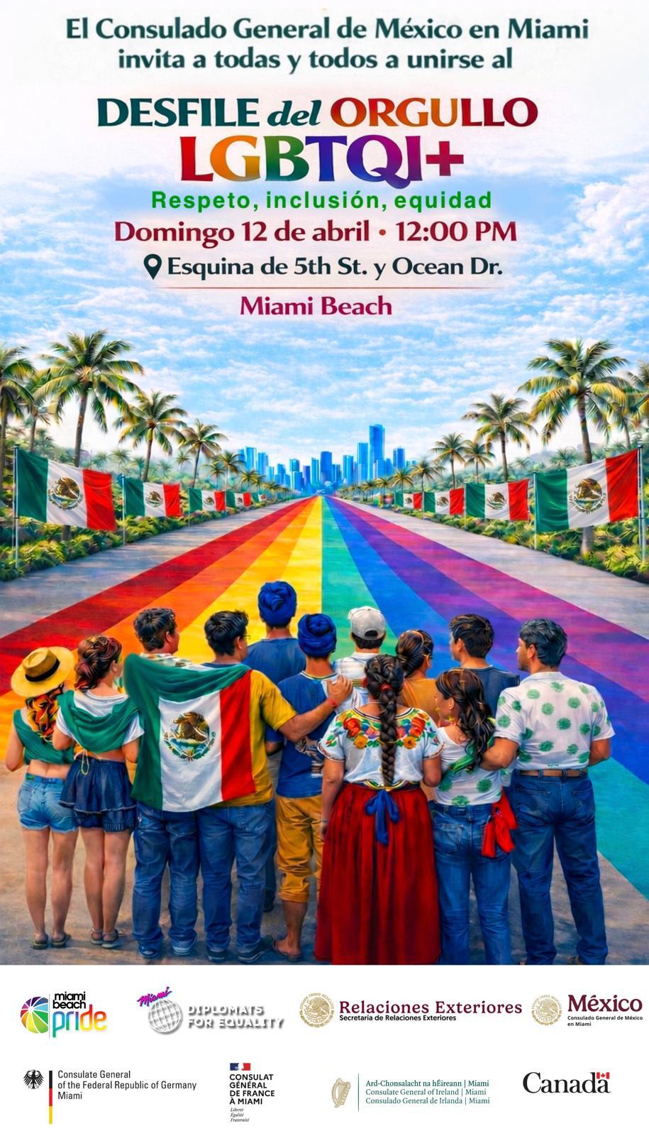 El domingo 12 de abril, el Consulado General de México en Miami desfilará, por quinto año consecutivo desde 2022, con el contingente de “Diplomats for Equality” conformado por 14 representaciones diplomáticas entre los que destacan los Consulados Generales de Alemania, Canadá, Francia, Irlanda y Reino Unido.