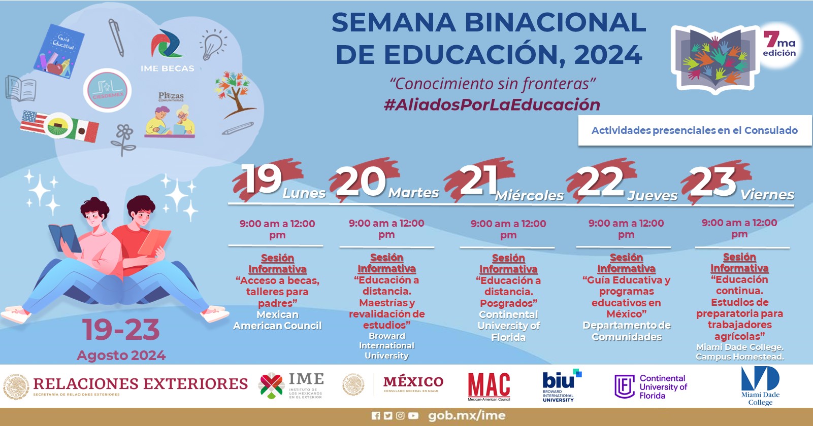 Del 19 al 23 de agosto de 2024, en el Consulado General de México en Miami y los Consulados y Embajadas en América del Norte, América Latina y Europa, se celebrará la Séptima Semana Binacional de Educación (SBE).