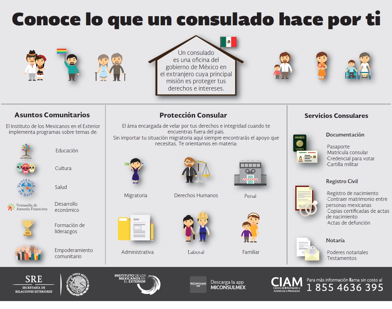 Los principales servicios que se brindan a los mexicanos son la expedición de pasaportes y credenciales del INE, el registro de nacimientos y de matrimonios entre mexicanos, la tramitación de poderes notariales, la expedición de cartillas militares y la legalización de documentos, entre otros.
