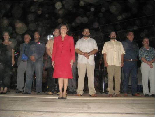 La Consul General de Mexico en Nogales, Arizona, Beatriz Lopez Gargallo, en ceremonia de bienvenida a las autoridades invitadas: De izquierda a derecha, el H. Alcalde de Nogales, Sonora, Marco A. Martinez Dabdoud y el Alcalde de Nogales, Arizona, Ignacio Barraza.