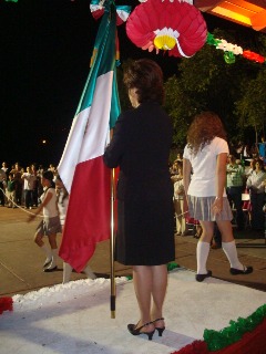 La Cónsul General de México en Nogales, Arizona, Beatriz López Gargallo, durante la ceremonia del 197 Grito Independencia, recibiendo el Lábaro Patrio del Capitan del H. Cuerpo de Bomberos de Nogales, Sonora