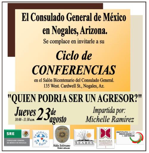 El jueves 23 de agosto de 2012, tuvo lugar en esta sede consular la conferencia “Quien podría ser un agresor”, la cual fue impartida por Michelle Ramírez, Presidenta y fundadora de la Organización “The Kennedy Club” y quien imparte conferencias y talleres sobre violencia en el noviazgo, y trabaja con personas con adicciones e involucrados en casos de violencia doméstica.