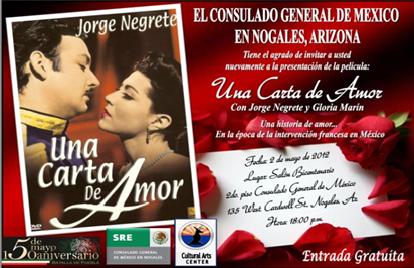 Miércoles 2 de mayo: Se exhibió por segundo año consecutivo la película “Una carta de Amor” en el Salón Bicentenario, es una película interpretada por Jorge Negrete y Gloria Marín, cuya trama consiste en una historia de amor que se inserta en la época de la intervención francesa.