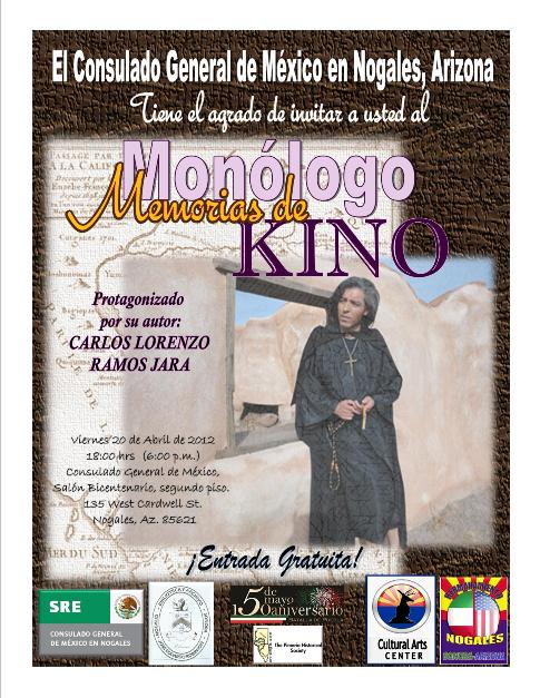 El 20 de abril de 2012, se presentó en el Salón Bicentenario de este Consulado General, el Monólogo “Memorias de Kino”, protagonizado por su autor Carlos Lorenzo Ramos Jara.
