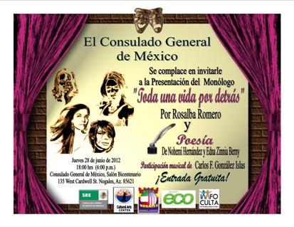 El jueves 28 de junio de 2012, se llevó a cabo en el Salón Bicentenario de esta representación consular, la presentación del monólogo “Toda una vida por detrás” de Rosalba Romero profesora de teatro del Instituto Municipal de Fomento a la Cultura y las Artes (IMFOCULTA) de Nogales, Sonora, interpretada por la propia autora, así como presentación de poesía de Nohemí Hernández, y Edna Zinnia Berny, escritoras locales. También se contó con participación musical de Carlos F. Gonzalez Islas del citado Instituto. En este espectáculo se conjugó la poesía, la música y el teatro.